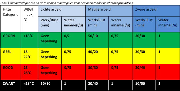 Het American College of Sports Medicine (ACSM) heeft richtlijnen opgesteld, waarin verantwoorde inzet- en rusttijden worden aangegeven en hoeveel water je per uur moet drinken (Tabel I). De tabel houdt geen rekening met het gebruik van persoonlijke beschermingsmiddelen. De in de tabel genoemde WBGT-index is een combinatie van luchttemperatuur, stralingsintensiteit en relatieve luchtvochtigheid en is een maat voor de klimatologische belasting. Dus NIET de temperatuur zoals je die afleest van een ‘gewone’ thermometer. In de gratis FNV Werkklimaat app kun je zien of je je werk nog veilig kunt doen bij verschillende temperaturen. Bij een langere inzet is het zaak dat regelmatig te blijven doen, omdat de klimatologische omstandigheden kunnen veranderen.