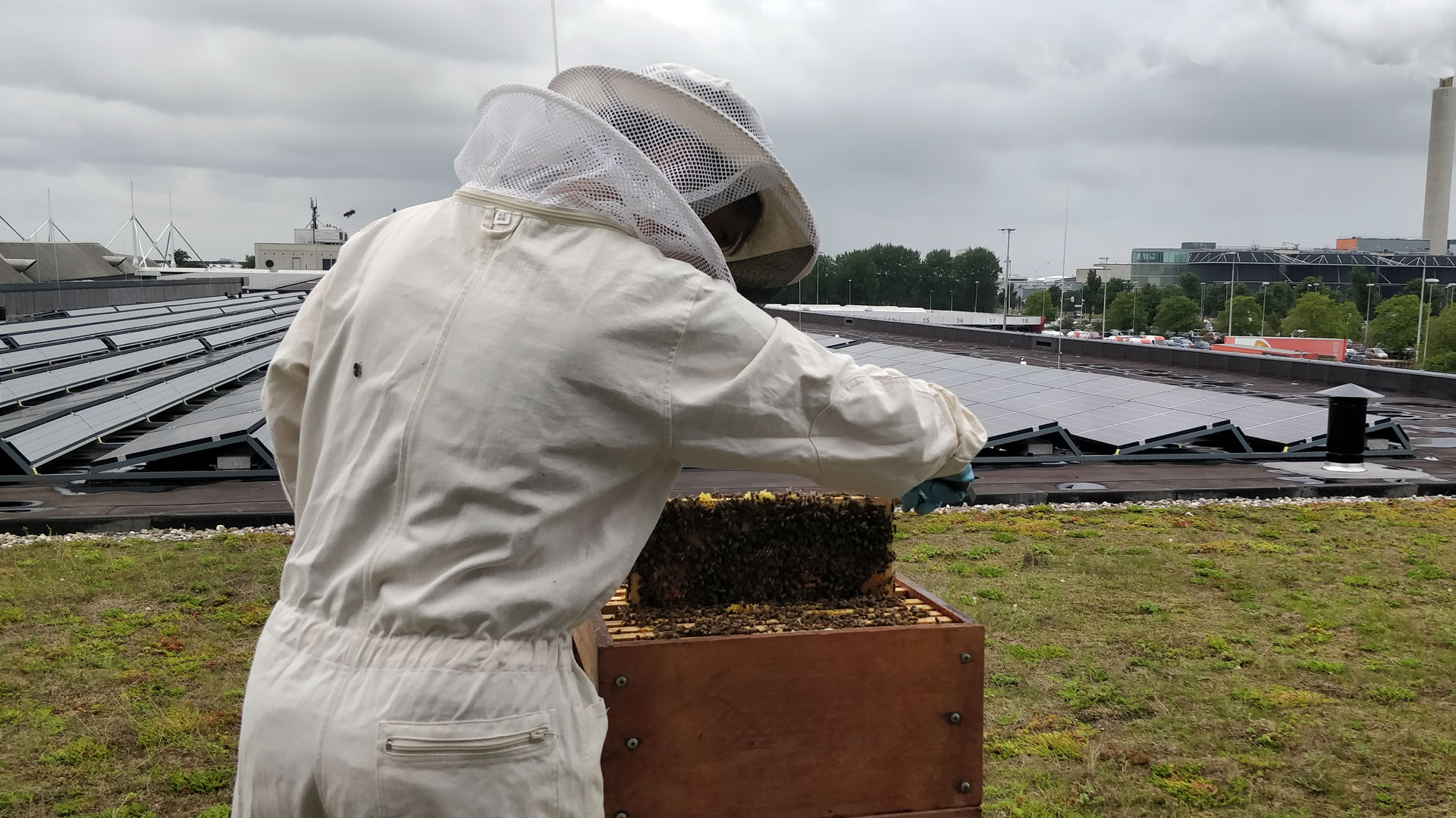 Op het Veiligheidscentrum in het Westelijk Havengebied wordt veel gedaan aan duurzaamheid. Zo wordt regenwater opgeslagen, is het gebouw gasloos en op het dak worden zonnepanelen gecombineerd met een groen dak van planten. Collega Bud Pronk van het Facilitair Bedrijf: ‘Ik vind het belangrijk dat de bijenpopulatie in Nederland in stand blijft. Via de stadsimker organiseerde ik een bijenkast met een volk. Ook nam ik contact op met het Havenbedrijf Amsterdam om te praten over bloemrijke bermen want genoeg stuifmeel en nectar is essentieel.’
