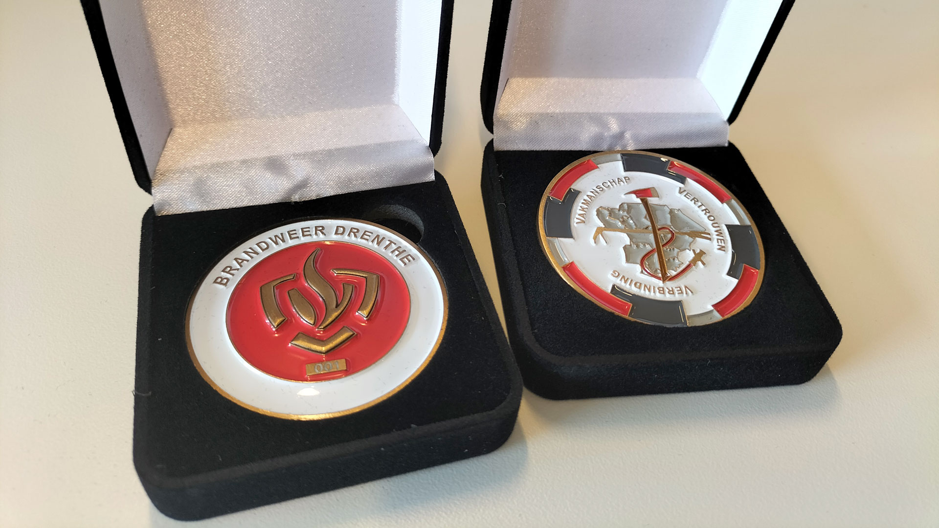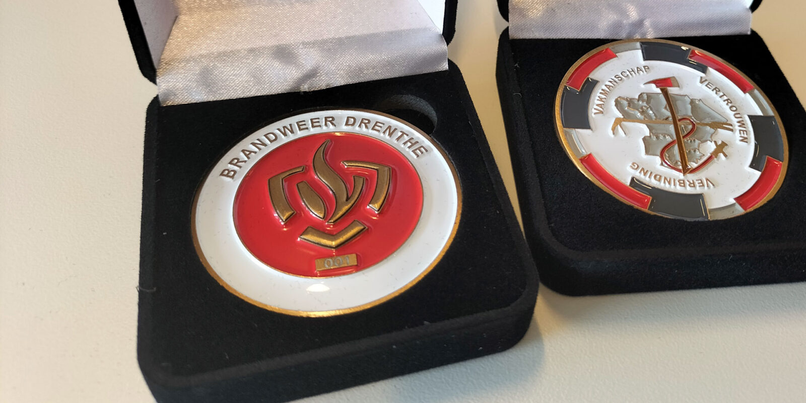 Aan de buitenrand vind je het logo van Veiligheidsregio Drenthe, waar Brandweer Drenthe onderdeel van is. De cirkel staat voor het continue proces, het kan rollen en geeft symbolisch weer dat er altijd beweging is. De blokjes symboliseren de samenwerking tussen de verschillende partners/partijen. Ze grijpen krachtig in elkaar en hebben de mogelijkheid om samen in beweging te zijn. De rode kleur is van de brandweer omdat zij een belangrijke drager is van Veiligheidsregio Drenthe. De woorden ‘Vakmanschap’, ‘Verbinding’ en ‘Vertrouwen’ staan synoniem voor wat belangrijk is om brandweerwerk uit te voeren. In het midden van de legpenning is de provincie Drenthe met de 12 Drentse gemeenten afgebeeld. Met enige verbeelding kun je in de provincie een gehurkte ademlucht drager ontwaren. De provincie Drenthe is doorkruist met een bijl, halligan tool en blusslang. Gereedschappen die synoniem staan voor brandweerwerkzaamheden.