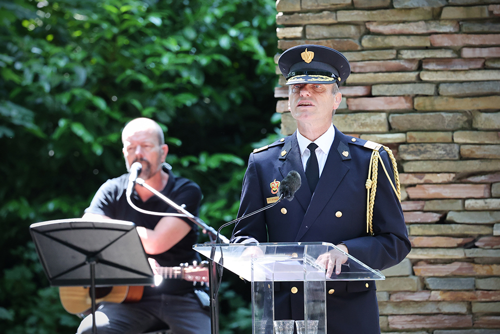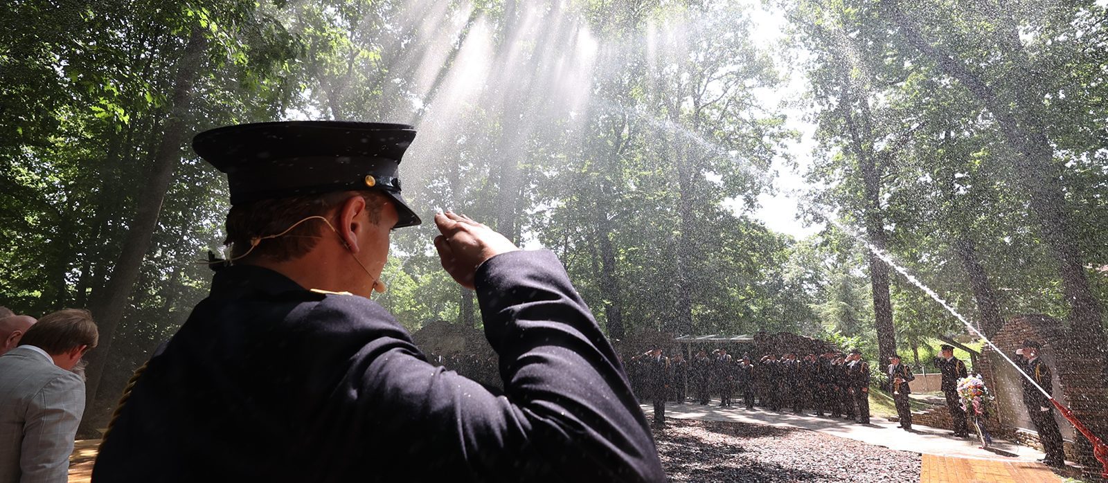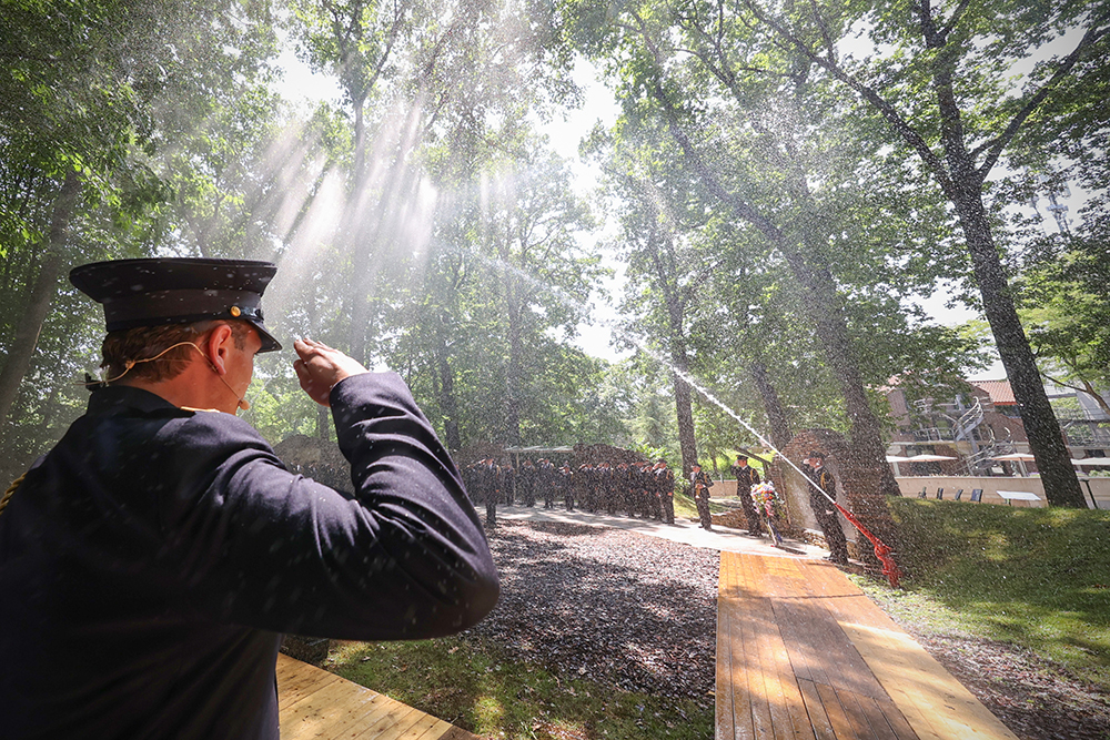 De namen van de brandweermensen die vernoemd staan op het brandweermonument, werden voorgelezen door officieren van de 54e opleiding. De 200 aanwezigen waren een minuut stil tijdens het indrukwekkende water-ereteken.