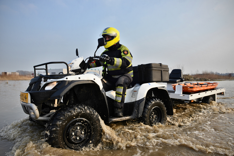 ‘In het natuurgebied Sophiapolder kun je via een voetveer een wandeling maken van 3,5 kilometer over vlonders en dijken. Met elf partijen, waaronder de politie en Rijkswaterstaat, hebben we destijds nagedacht over het verbeteren van de veiligheid in dat gebied. Daarvoor is nu in Hendrik-Ido-Ambacht een quad gestationeerd. De quad met aanhanger beschikt over een brancard, communicatiesysteem C2000, zwemvesten, een knipschaar, een zoeklicht en een kleine brandblusser.’