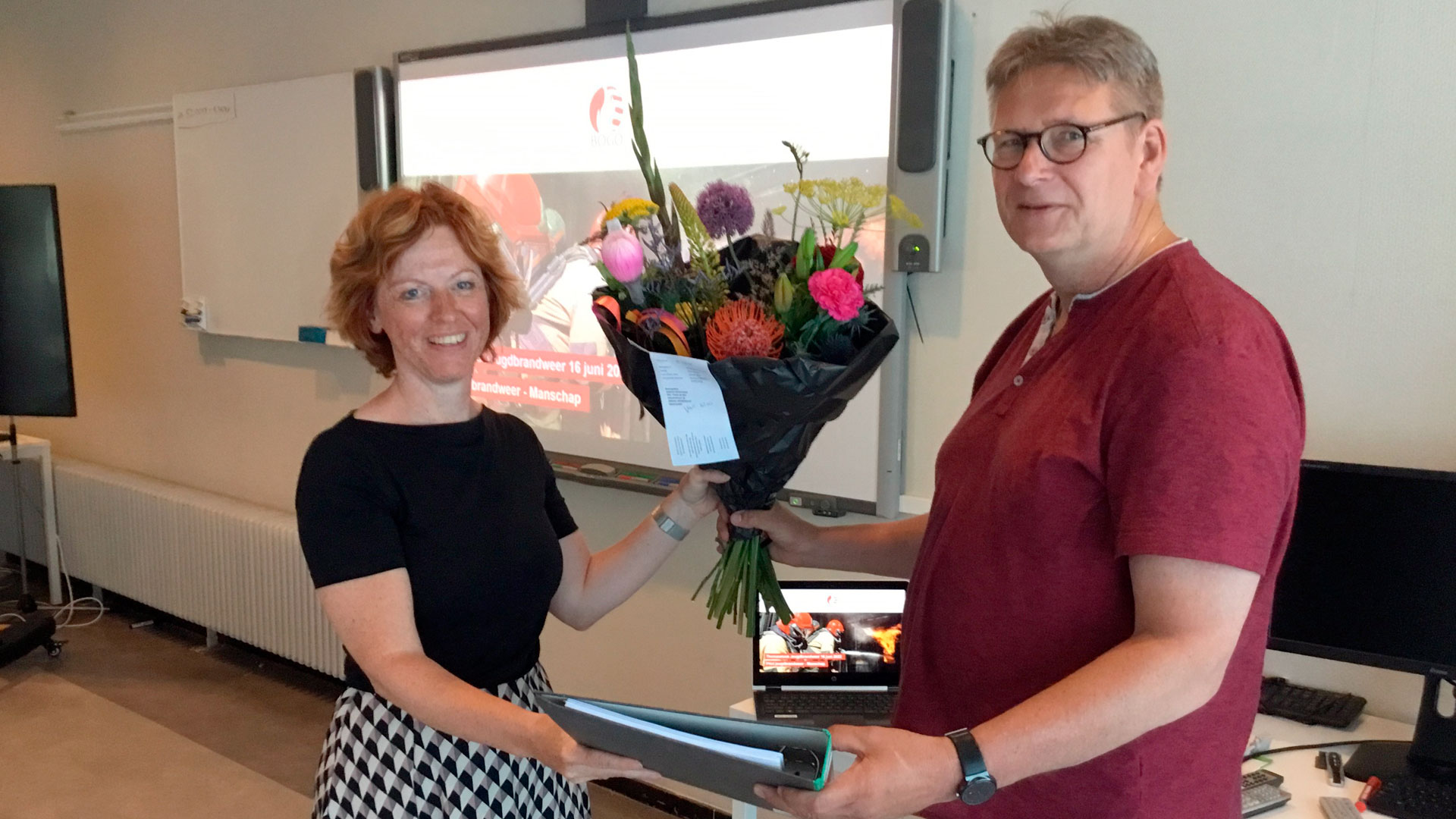 Foto: Projectleider Natasja Scheinhardt zwaait af en krijgt een bedankje uit handen van Lex Tillart.