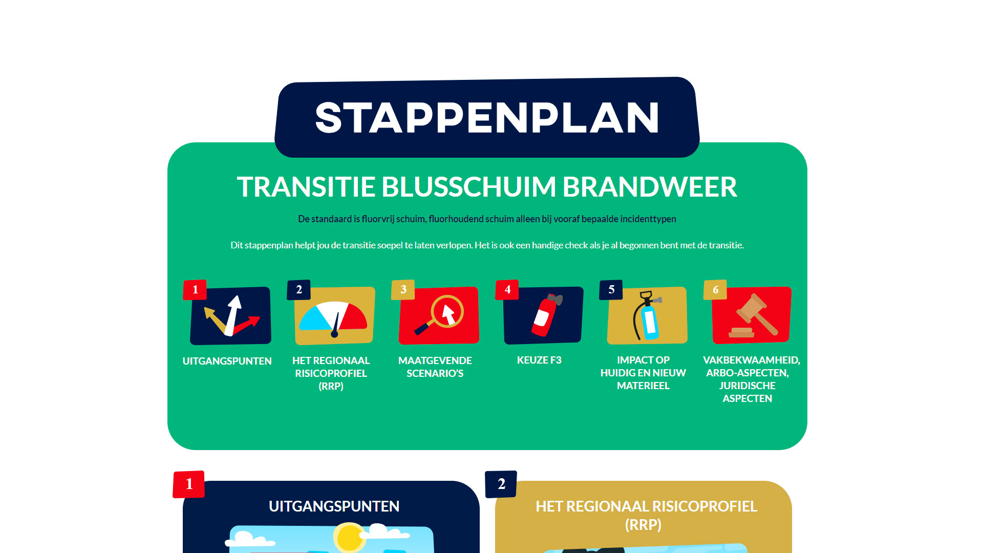 Fluorvrij blusschuim vraagt om een andere werkwijze. Zo zijn mogelijk aanpassingen nodig aan het materieel en kan bijscholing nodig zijn voor de brandweermensen die een schuiminzet moeten uitvoeren. Daarnaast is de keuze voor het juiste blusschuim essentieel om effectief te kunnen blussen of voor het goed afdekken van een giftige plas. Om een veilige transitie te maken naar fluorvrij blusschuim is er een handig stappenplan ontwikkeld voor veiligheidsregio’s, Brandweer en Bedrijfsbrandweer. Dit helpt om bijvoorbeeld wegwijs te worden in verschillende normeringen en schuimkenmerken bij de aanschaf van het juiste blusschuim. Het stappenplan vind je op www.transitieblusschuim.nl.