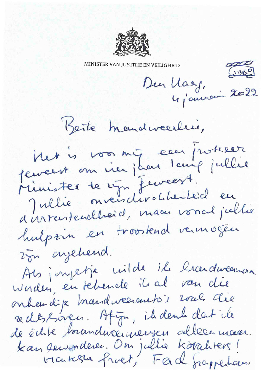 Brandweer Nederland dankt de heer Grapperhaus voor zijn betrokkenheid bij ons vak.
