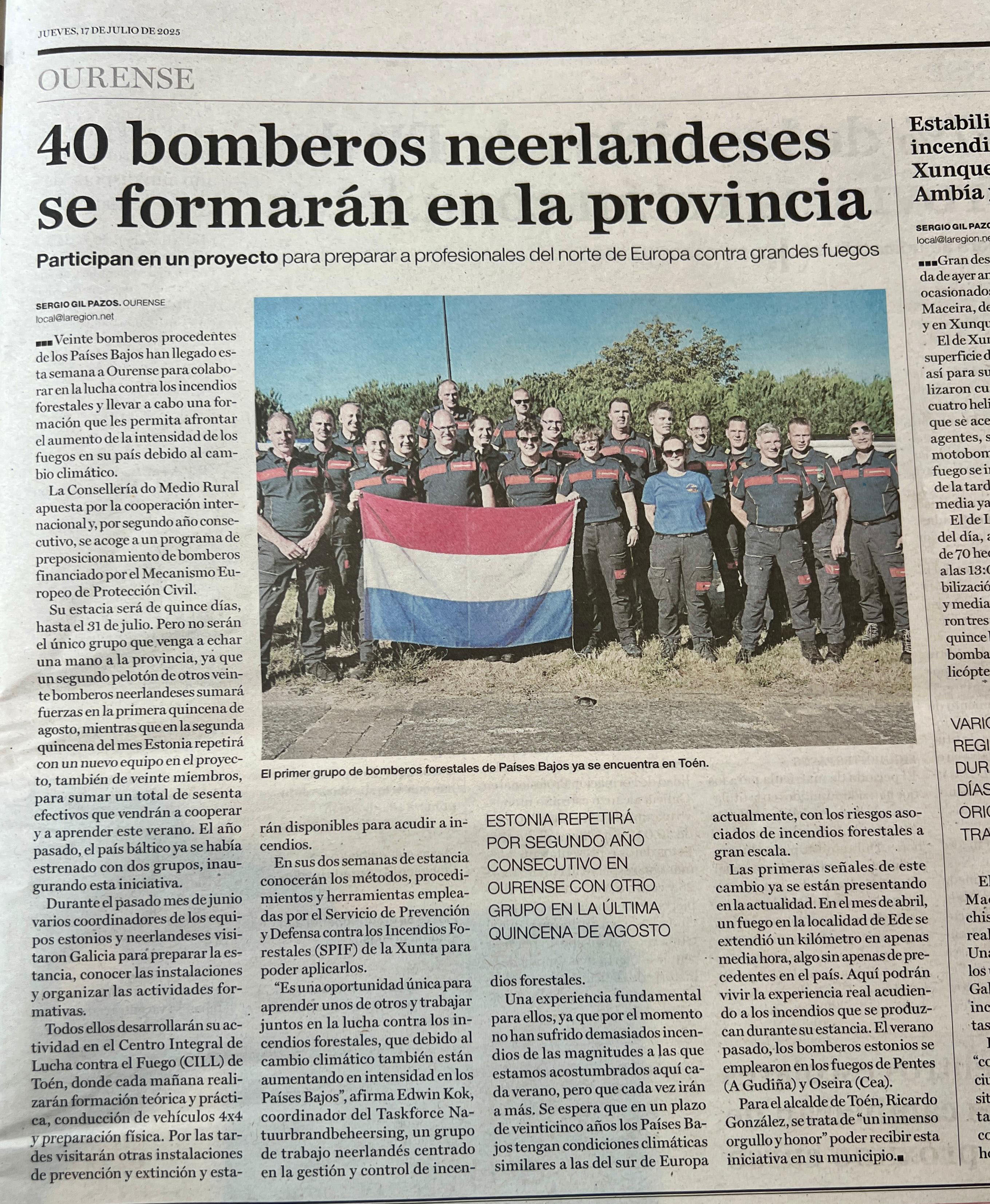 Voor volgende week wordt een zeer hoog tot extreem natuurbrandrisico verwacht in grote delen van Galicië. Een hittegolf, met temperaturen die ook in de omgeving van Ourense ruim boven de 40 graden kunnen uitkomen, zorgt voor zware omstandigheden. In de afgelopen week is er in totaal meer dan 500 hectare natuurgebied verbrand in Galicië en de verwachting is dat dit volgende week verder op zal lopen, waardoor de kans groot is dat het Nederlandse team een aantal flinke inzetten voor de kiezen krijgt.