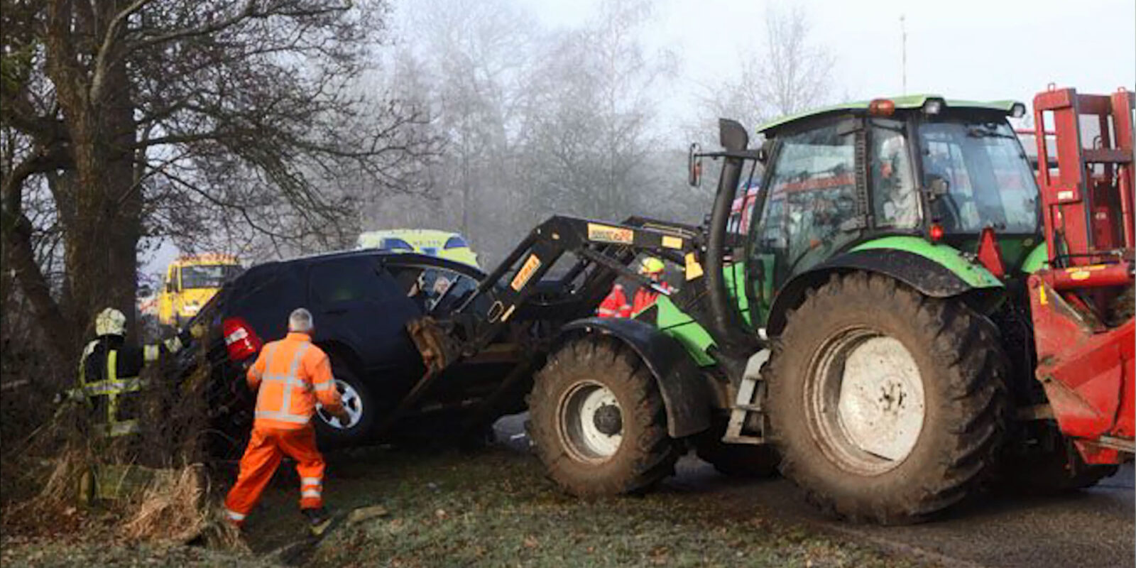Wat nu, denkt de bevelvoerder. De auto ligt op de kant tegen de boom. In de auto zit een slachtoffer vast. Om hem eruit te krijgen moet de auto rechtop worden gezet. Het hulpverleningsvoertuig kan de auto rechtop trekken alleen zal hij met een klap neerkomen. Een onwenselijke situatie voor zowel slachtoffer als de hulpverlener die in de wagen het slachtoffer stabiliseert. Dan heeft de bevelvoerder een idee en vraagt de eigenaar van de naastgelegen boerderij om hulp. Er wordt een trekker gehaald en zeer beheerst wordt de auto rechtop gezet. De brandweer haalt het slachtoffer met behulp van zwaar redgereedschap uit de auto.